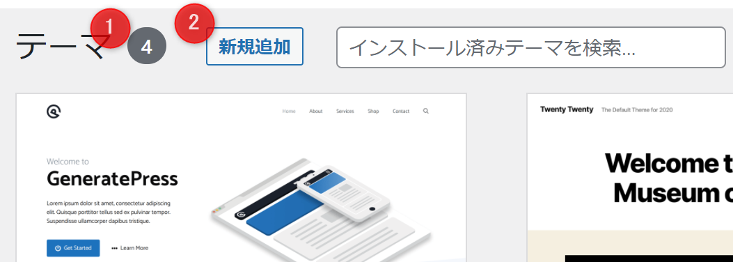 すると、上図のように「テーマ」画面に遷移しますので(左メニュー省略)、②の「新規追加」ボタンをクリックします。①には、現在インストールされているテーマの下図が表示されています。不要なテーマは(通常は大丈夫ですが)セキュリティ上問題になることもあるので、納品時にはアンインストールするとよりいいでしょう。