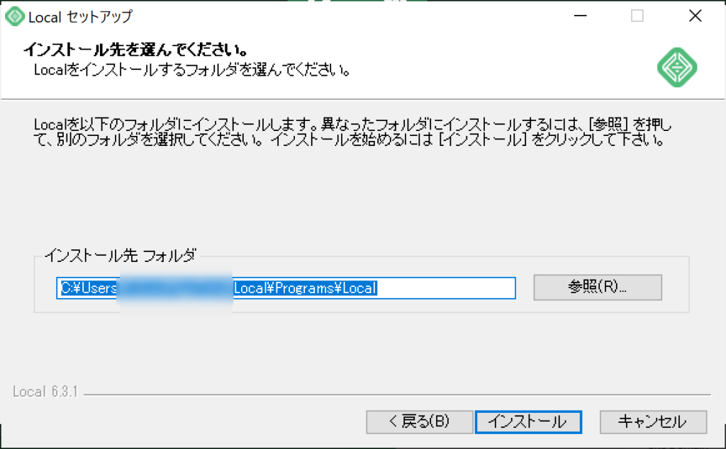 続いてインストール先を選びます。ここは特別な理由がなければ標準の場所で問題ないです。「現在のユーザーのみにインストール」する場合は、通常のProgram Files ではなく、Usersフォルダ内にインストールされます。あまり見ないパスですが、問題ありません。