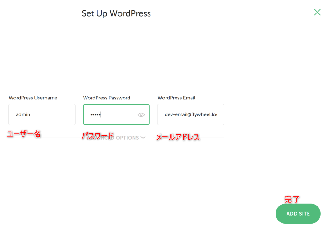 ですが、Local ではアクセスできるのがそもそもあなただけですので、これらの制限をとりはらって、簡単で分かりやすいパスワード、メールアドレスは標準で入力されているものでも構いません。